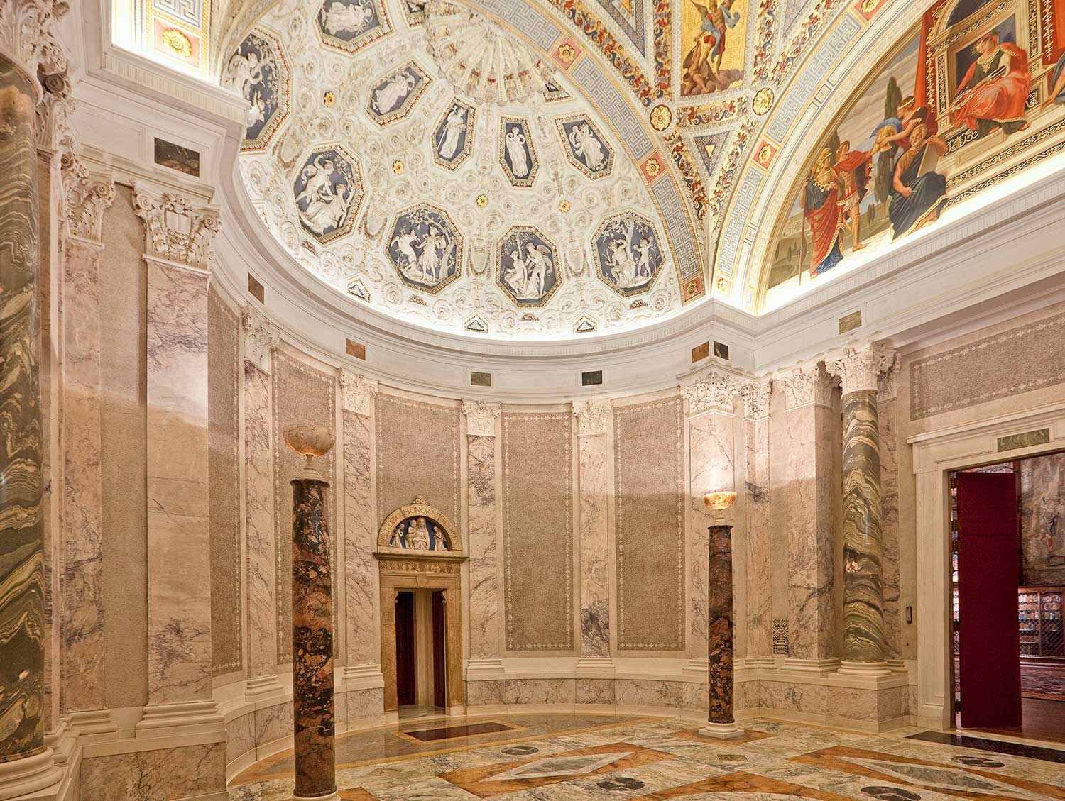 The incredible ceiling in the rotunda is the dramatic centerpiece of the building. Its intricate decoration reproduces characters from classical antiquity and other literary eras of the past, particularly Homer, Dante and Petrarch. Brightly-colored marbled surfaces, mosaic panels and lapis lazuli pillars enhance the richness of color.